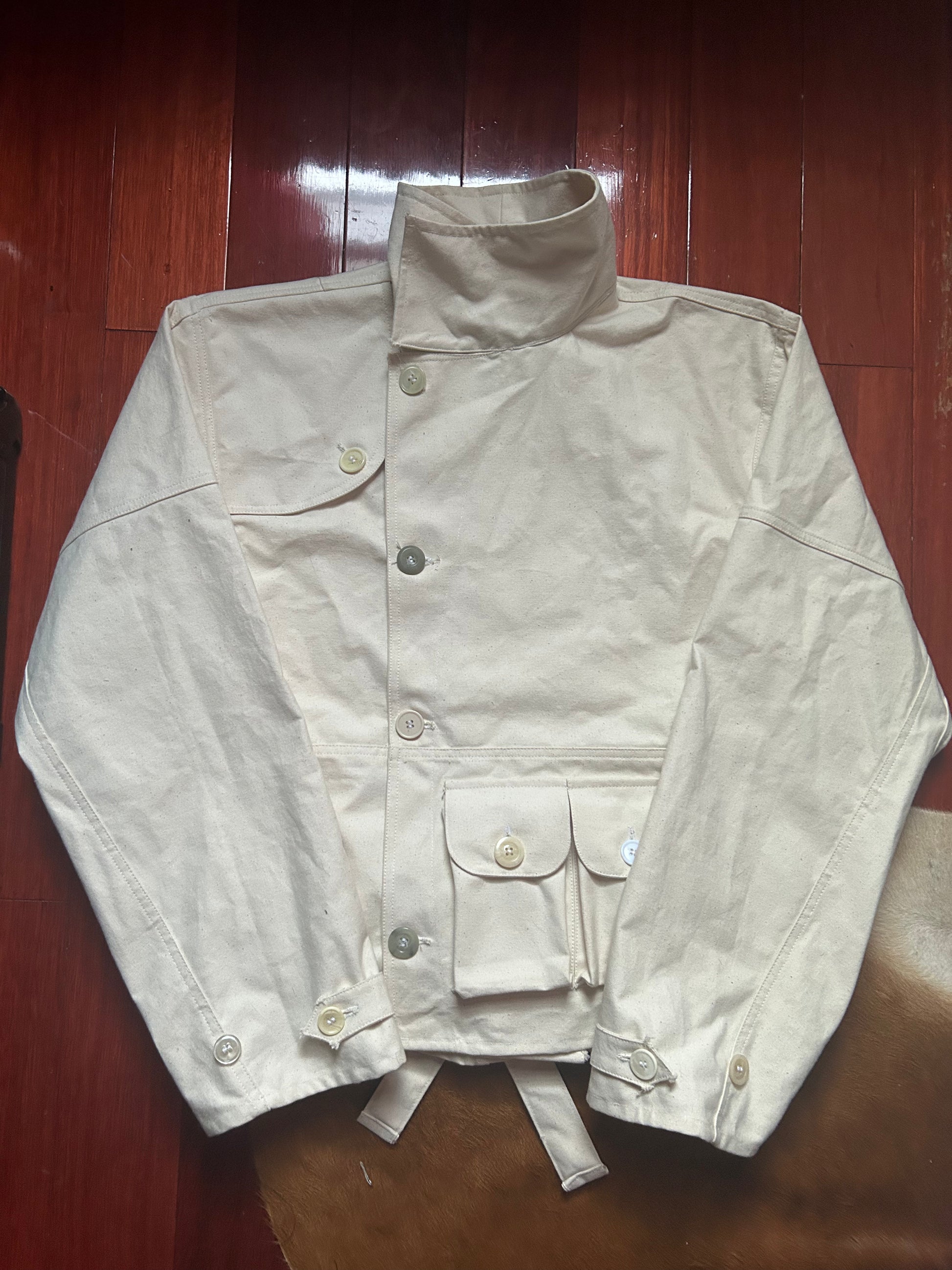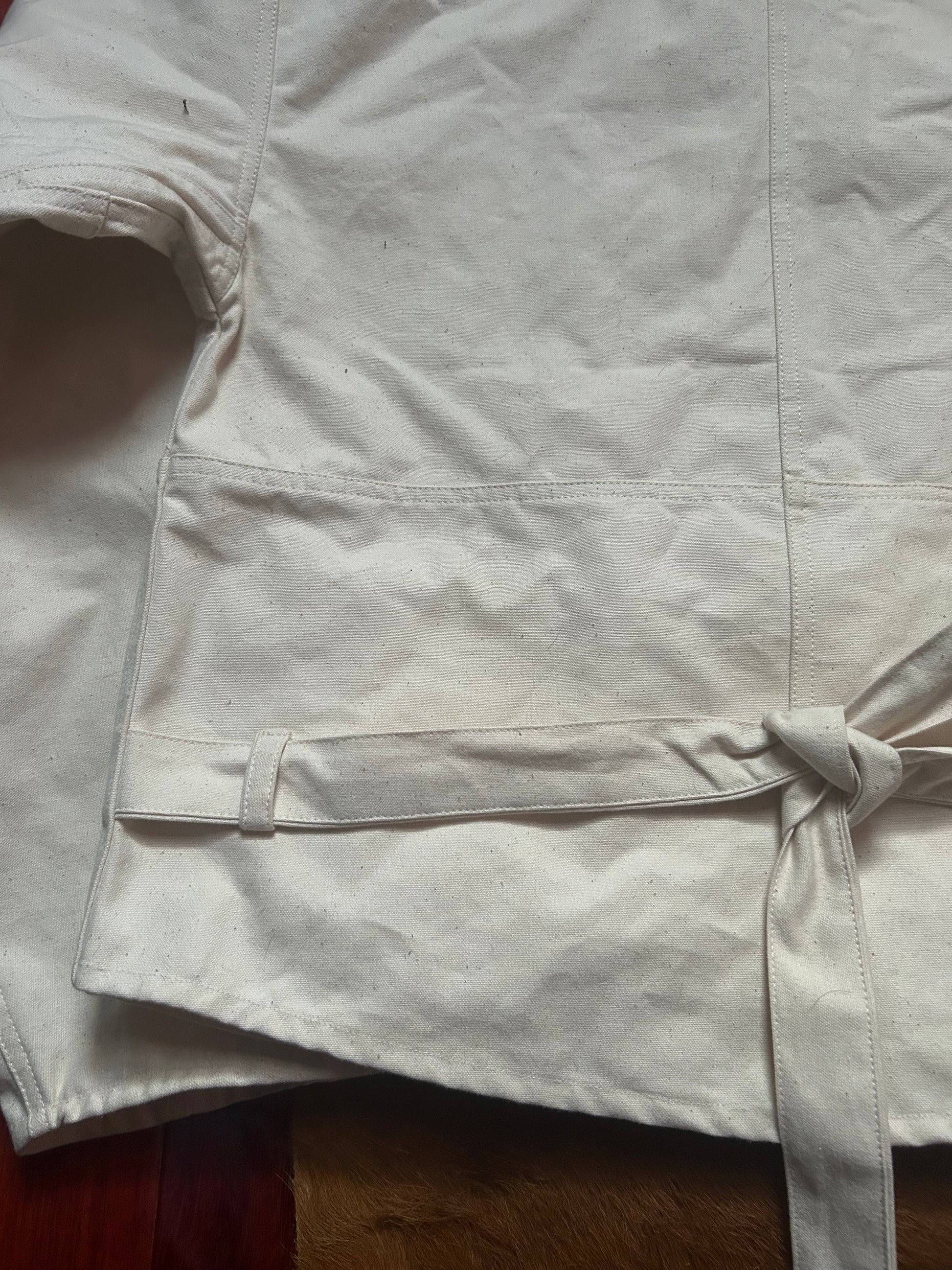 13 oz %100 cotton canvas. With a stand collar, asymmetrical button closure, triple front flap pockets, adjustable cuffs, and cinch-back detail. Unlined, Every seam is flat felled, Made for longevity :)